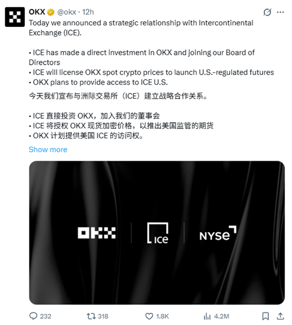 近日,全球金融与数字资产赛道迎来重磅消息:纽约证券交易所(NYSE)母公司洲际交易所(ICE)正式对全球头部加密货币交易所OKX完成战略投资,OKX的估值也因此直冲250 亿美元。