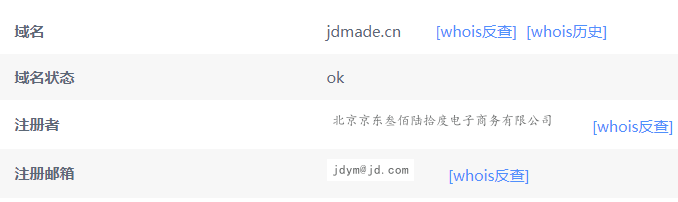 查询注册信息发现,JDmade.cn其实是一枚到期删除域名,起初注册于2017年4月份,但由于前任持有人没有续费导致域名过期删除;2019年3月1日,域名JDmade.cn被重新注册,而新的持有人则显示为“北京京东叁佰陆拾度电子商务有限公司”,既京东。
